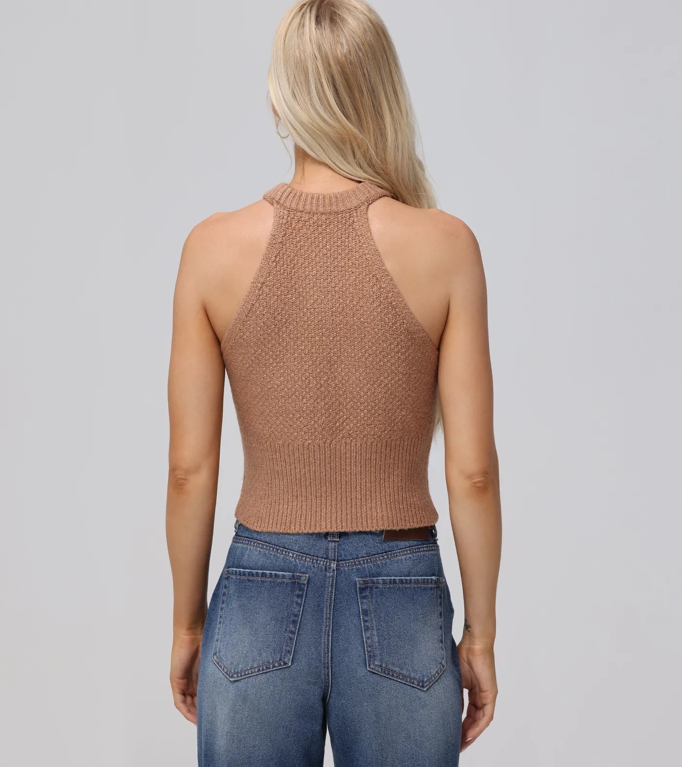 Stay warm and stylish with this halter-neck sweater! The unique cable stitch adds texture while the wide rib trim provides a flattering fit. Perfect for layering or making a statement on its own. Don’t sacrifice comfort for style – this sweater has you covered!Material : 55% Cotton, 33% Acrylic, 9% Polyester, 2% Nylon, 1% SpandexCare Instructions : Machine wash cold, dry flatSleeve Length : Sleeveless Halter neckline Cable stitch Wide Rib Trim